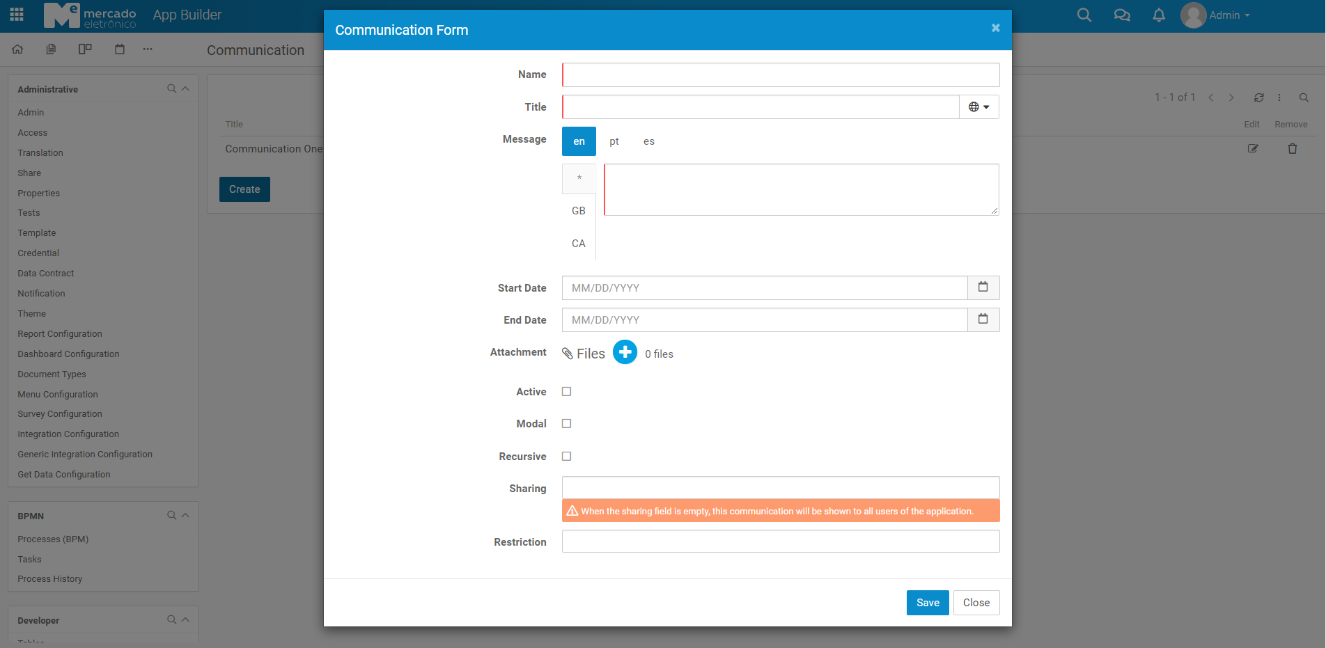 Sharing - This field indicates who should view the communication. When this field is empty, it will be shown to all users of the app.