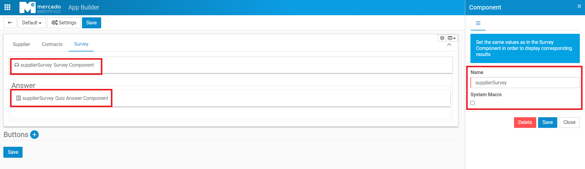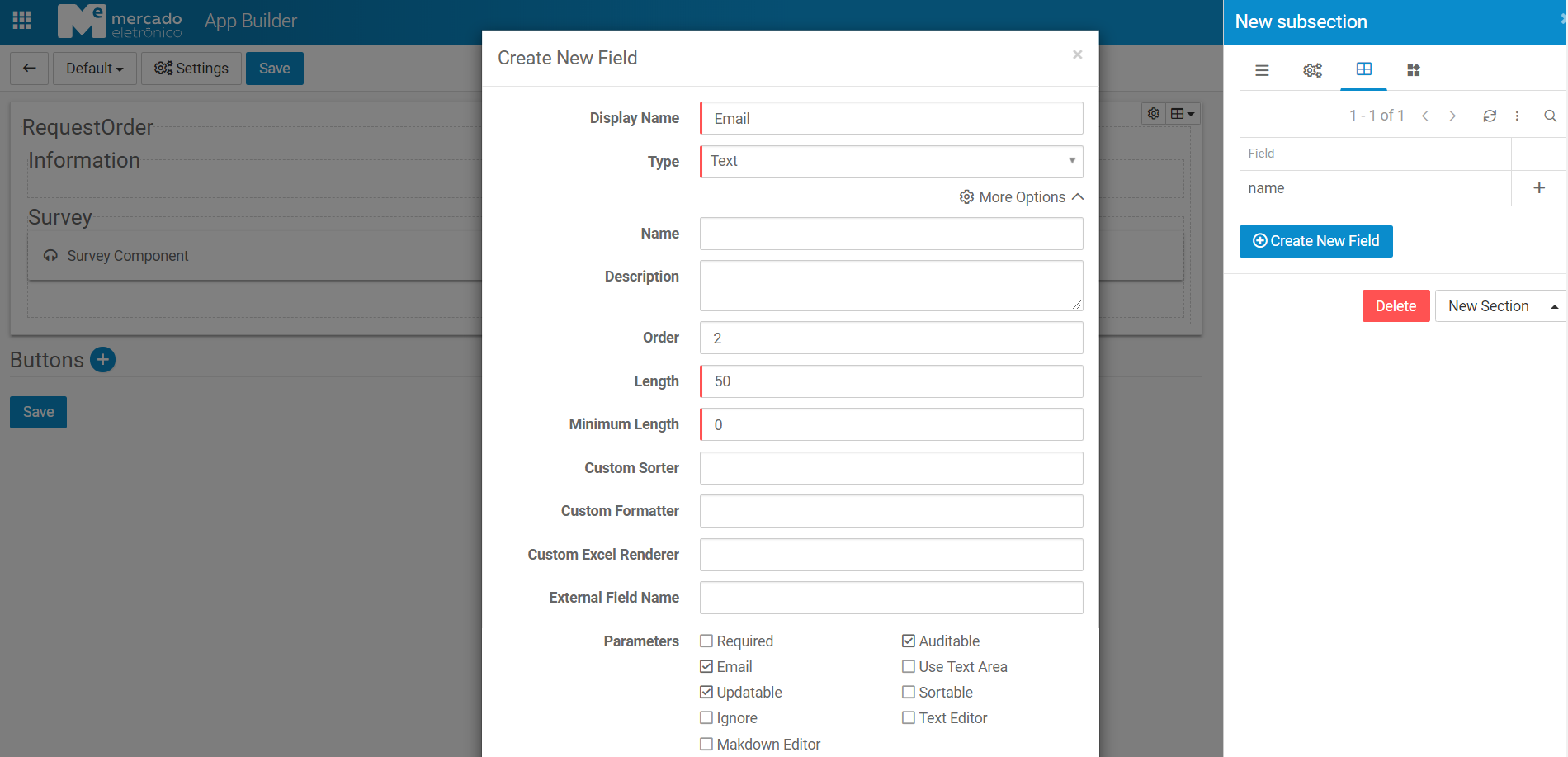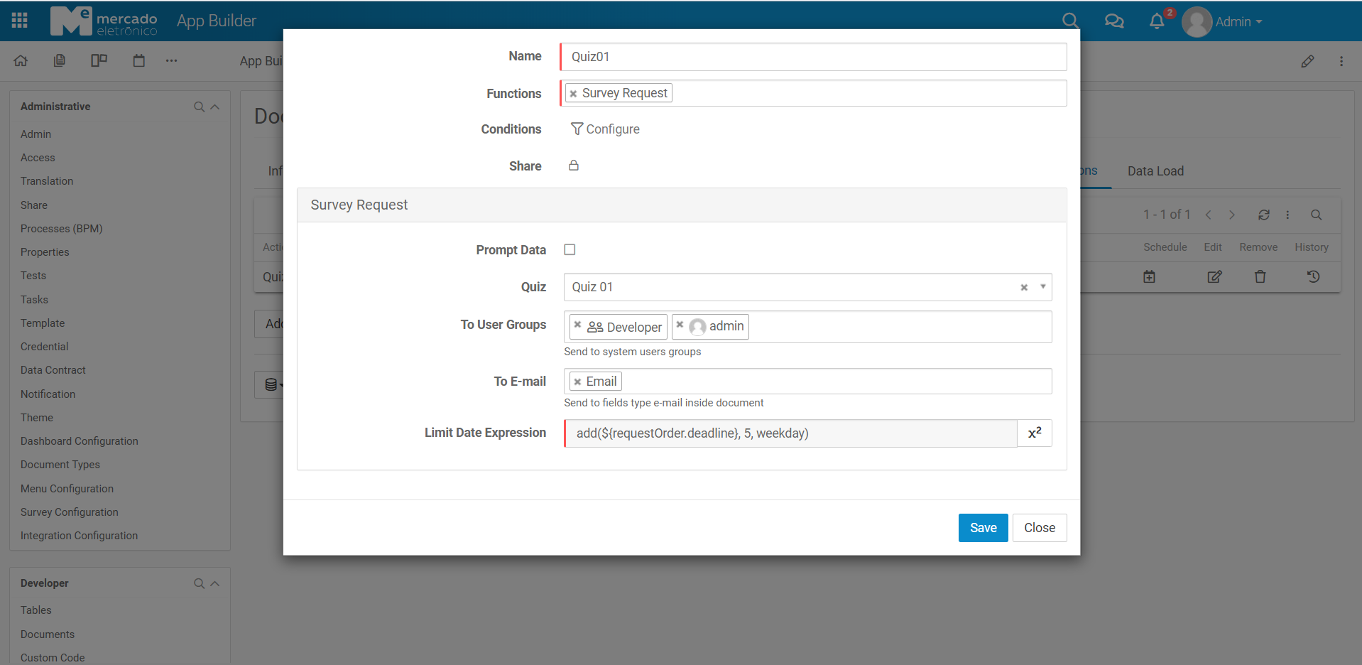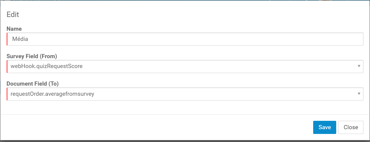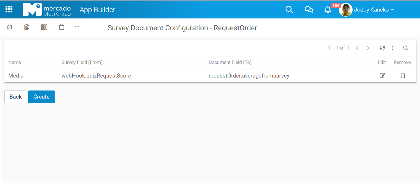 - To create the configuration that will be returned from the Survey to appBuilder, fill Name and choose the Survey Field(From) and Document Field(To).