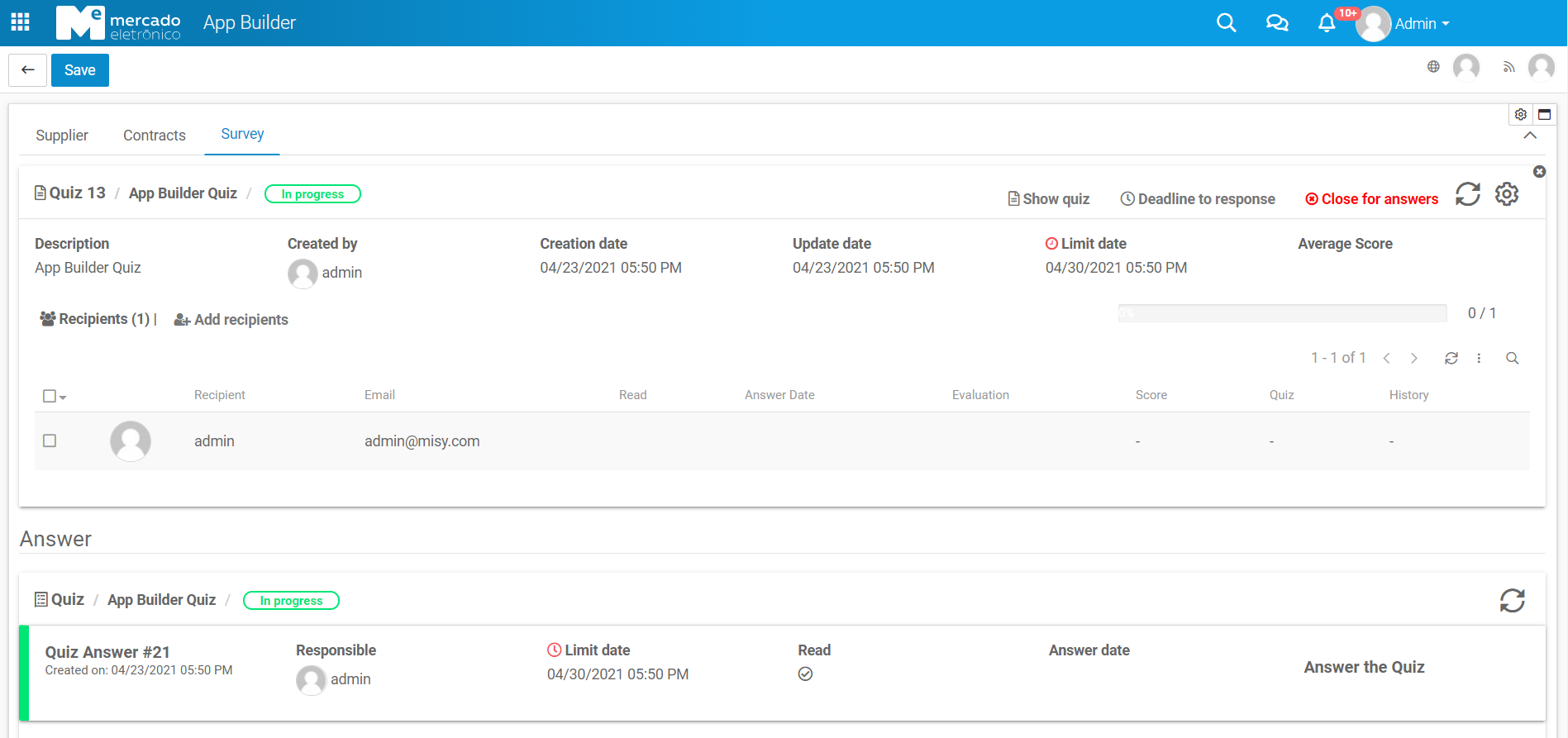 Quiz Answer #: QuizAnswer document ID in the Survey app;Created on: QuizAnswer document creation date;Responsible: Quiz recipient;Limit date: Deadline date to answer the quiz;Read: Quiz answer read date;Answer date: Quiz answer date;Answer the Quiz: Link to the quiz answer in the Survey app.