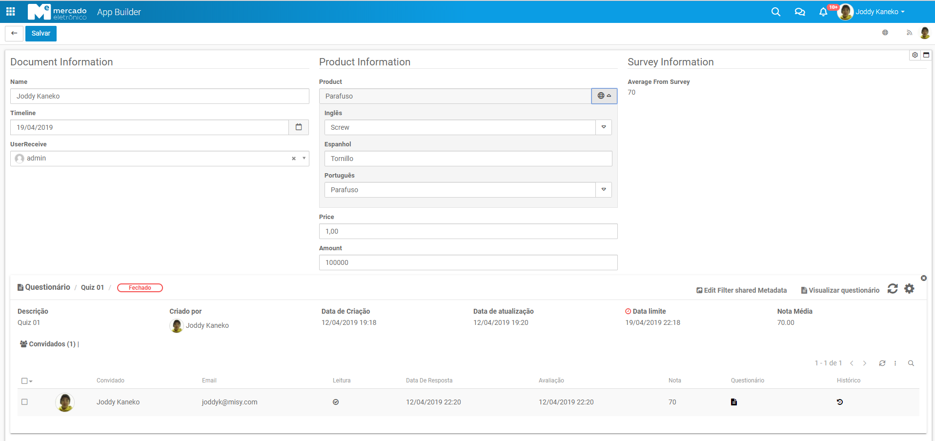 note: the Document field Average From Survey was filled by the configured return.
